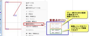 座標値が同じ座標点が複数登録されている(重複点)と、プロット画面に表示される点番は重複点で一番最後に登録された点番です。表示されるプロットマークも最後に登録された点のプロットマークになります。